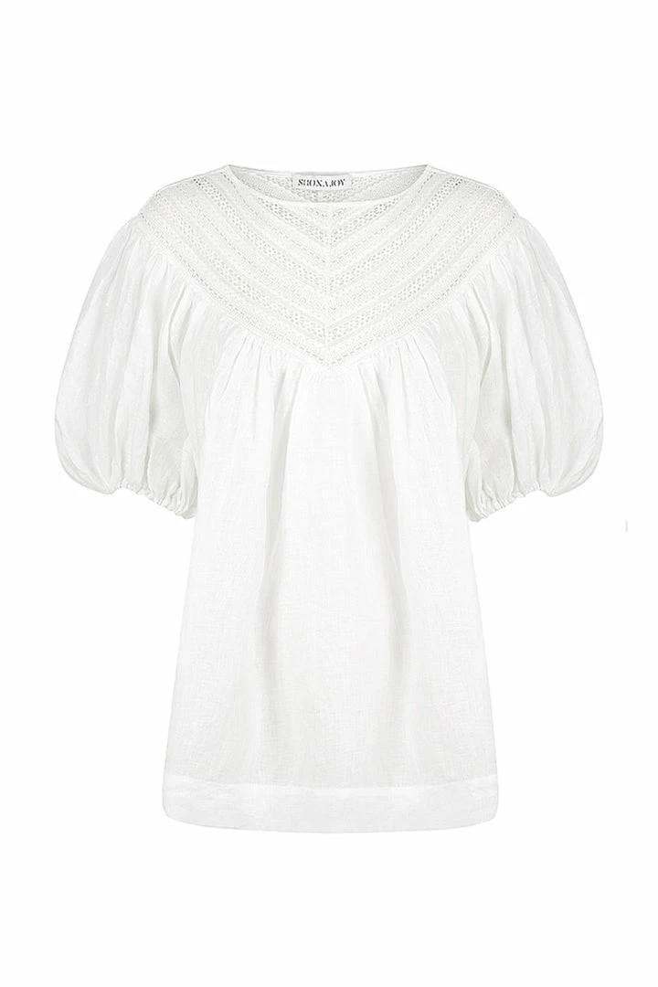 Balloon sleeve blouse with lace trims throughout in a pure semi-sheer textured linen.