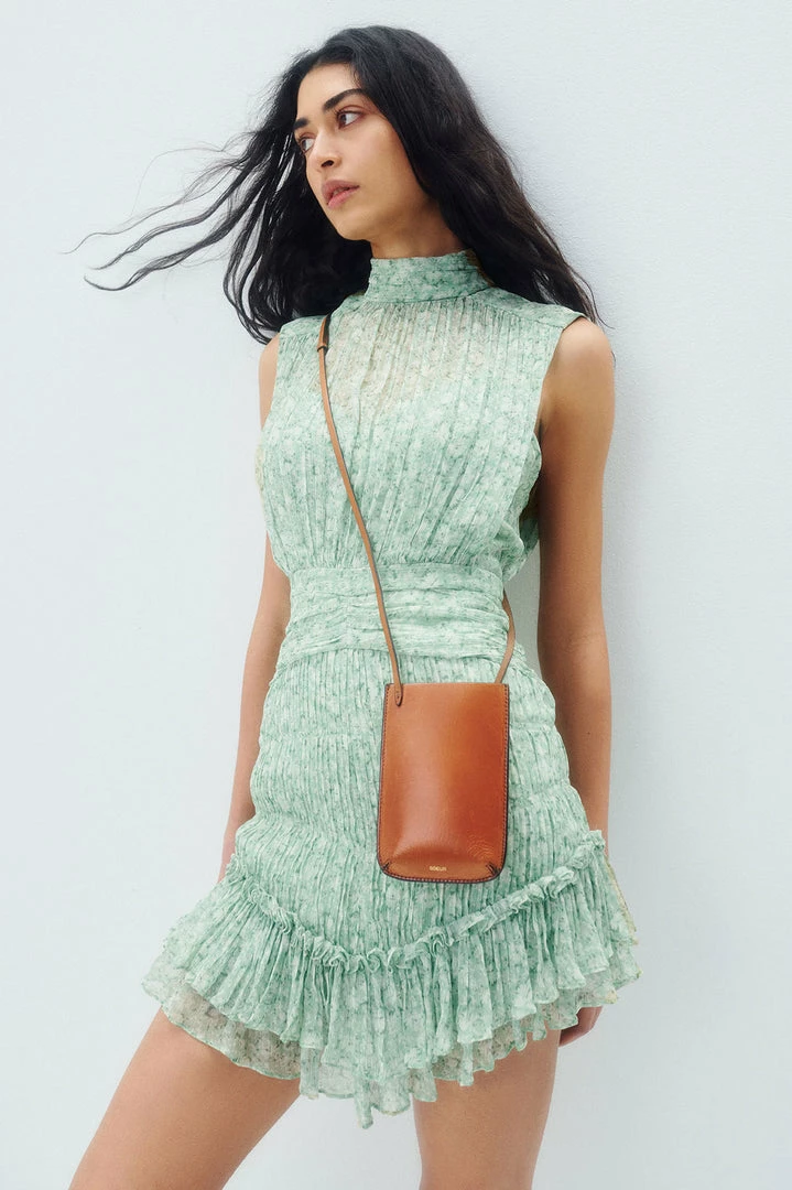 Sleeveless ruched mini dress in a light weight semi-sheer chiffon in the exclusive Aurore print.