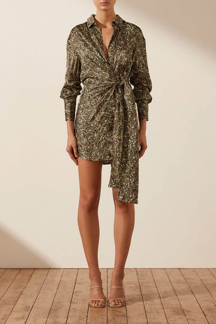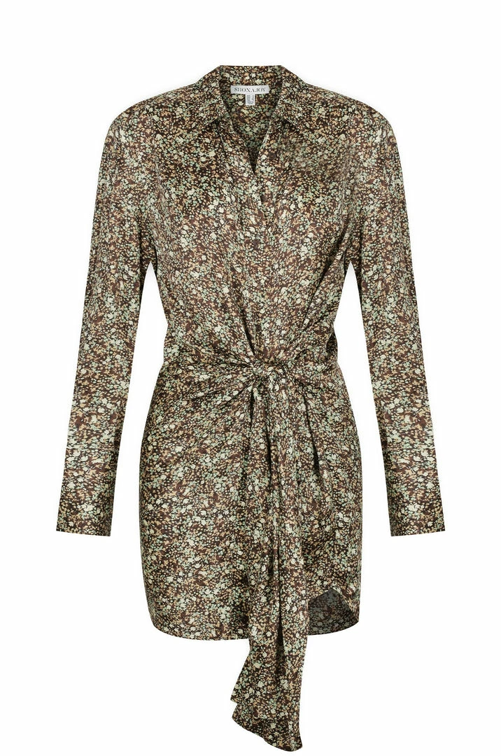 Tie front mini shirt dress in a silk blend fabric with a luxurious sheen in the exclusive Avriel print.