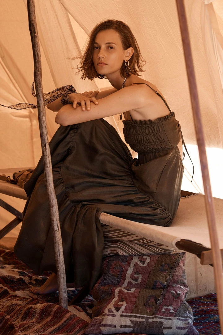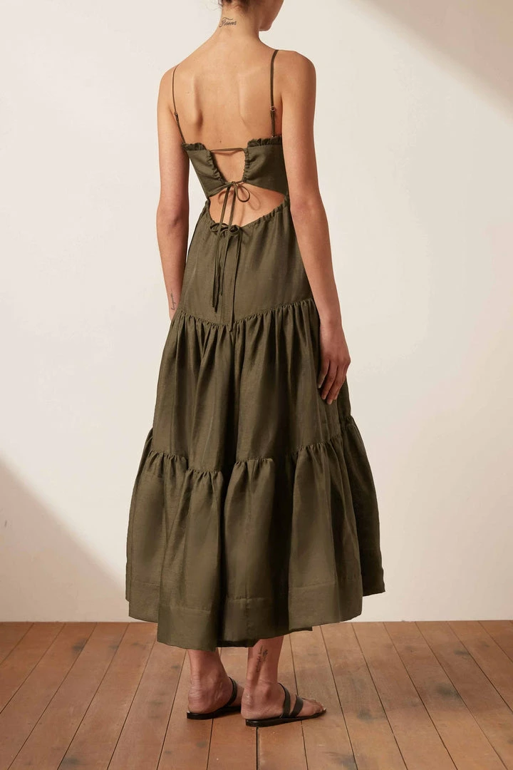 Shirred tiered midi dress with open back in a luxurious linen blend with slight sheen.