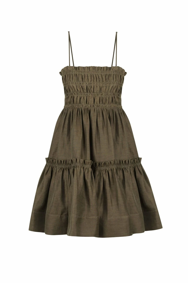 Shirred tiered mini dress in a luxurious linen blend with slight sheen.
