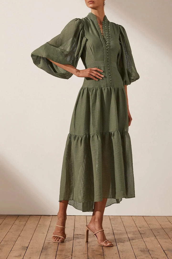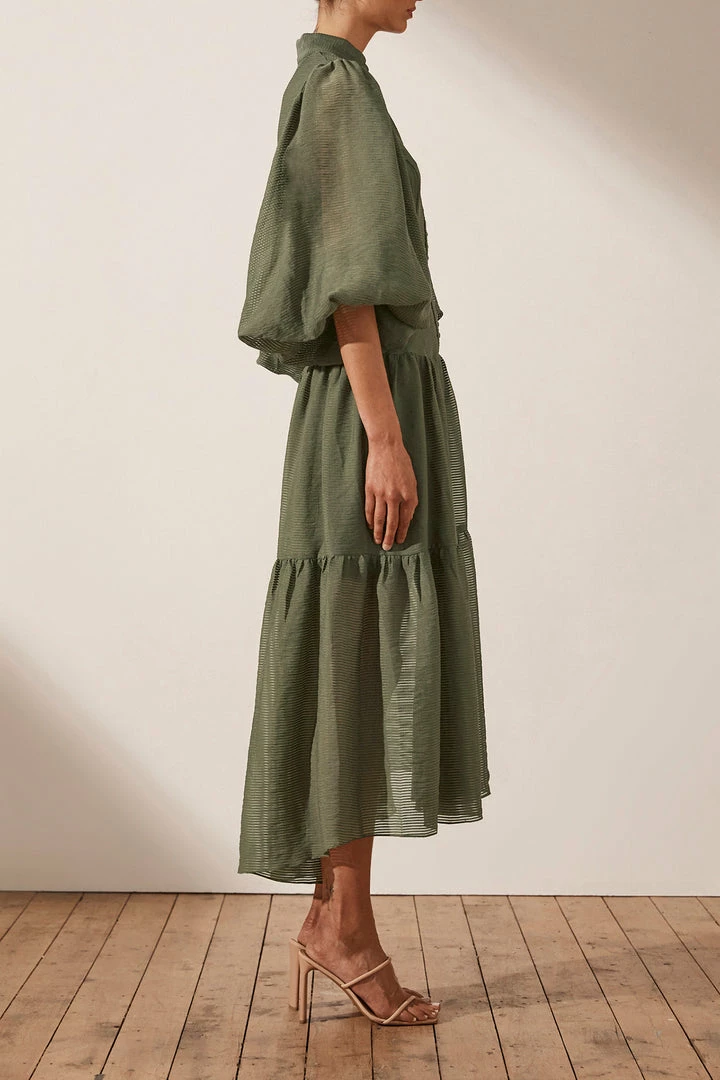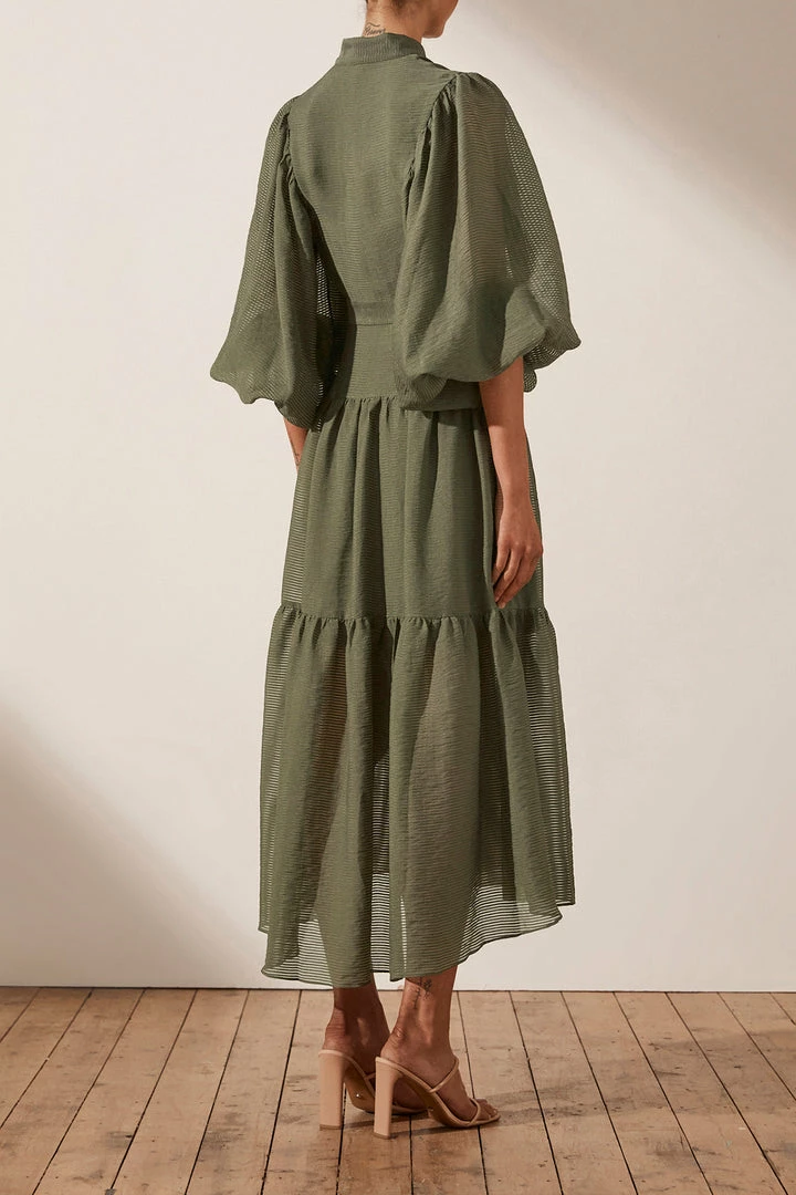 High neck midi dress in a luxurious textured semi-sheer stripe.