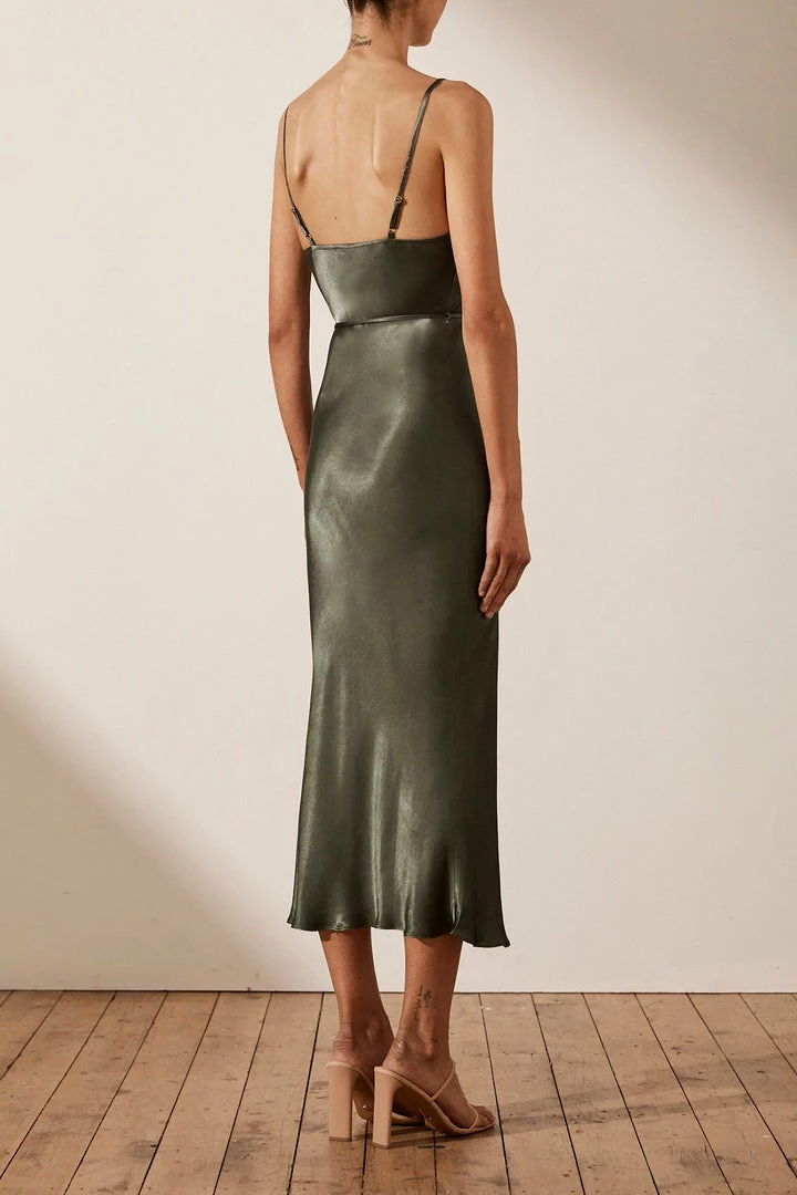Bias cowl midi dress in a silk touch fabric with a luxurious sheen.