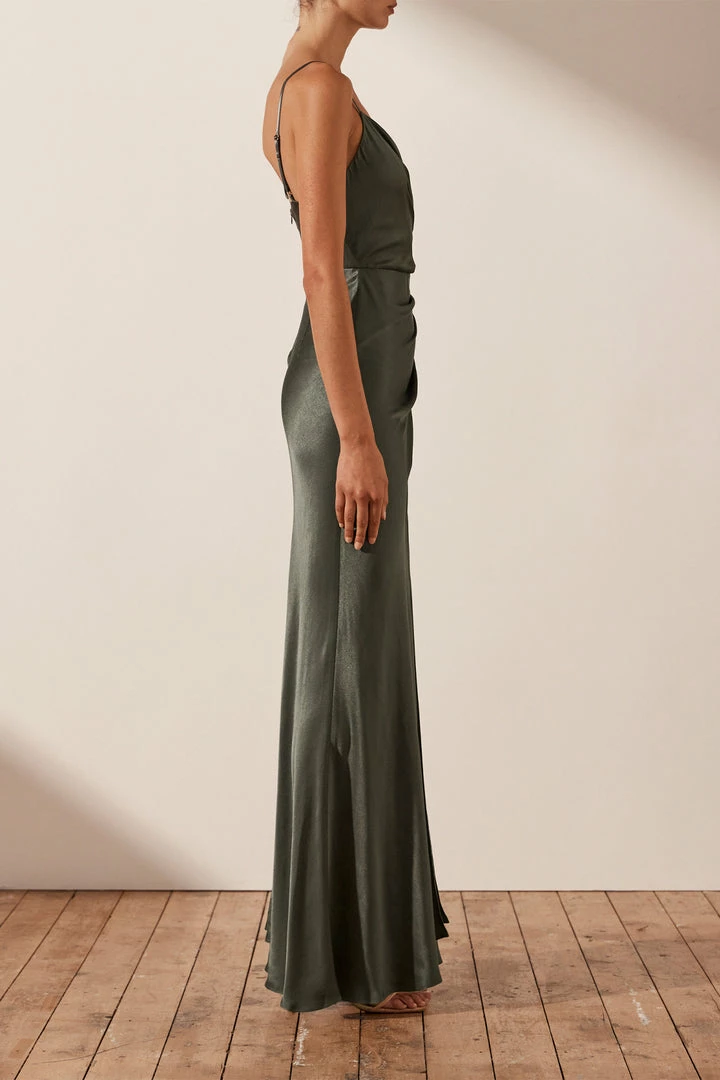 Cross over cowl draped maxi dress in a silk touch fabric with a luxurious sheen.