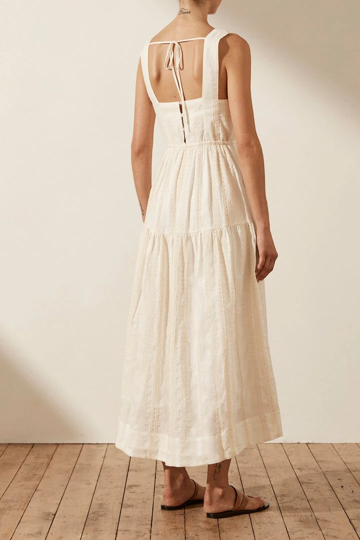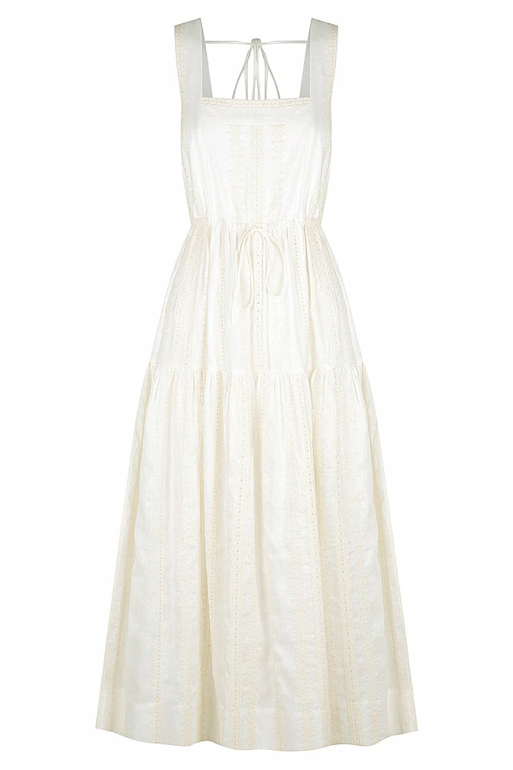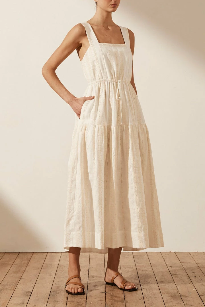 Square neck midi dress in a linen broderie englaise.