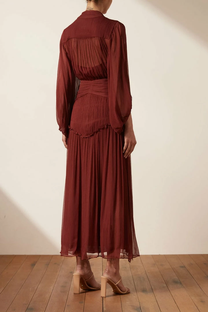 Balloon sleeve ruched midi dress in a light weight semi-sheer chiffon.