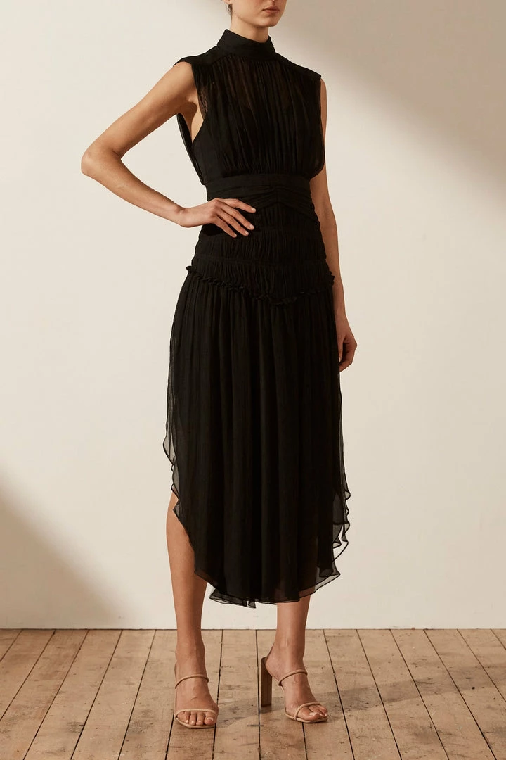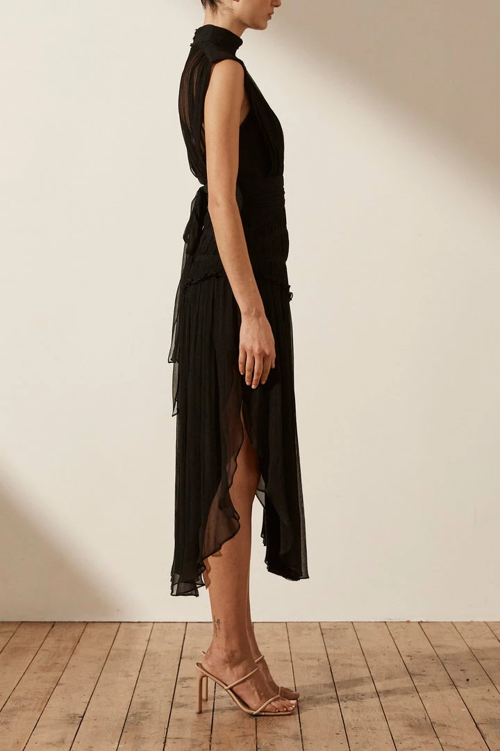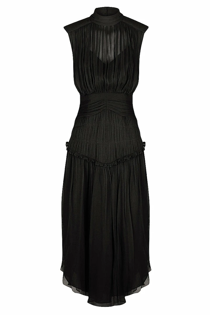 High neck sleeveless midi dress in a light weight semi-sheer chiffon.