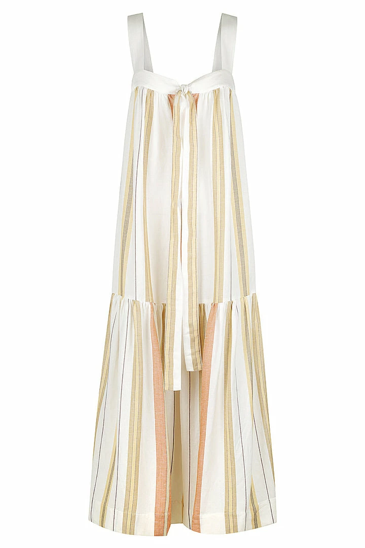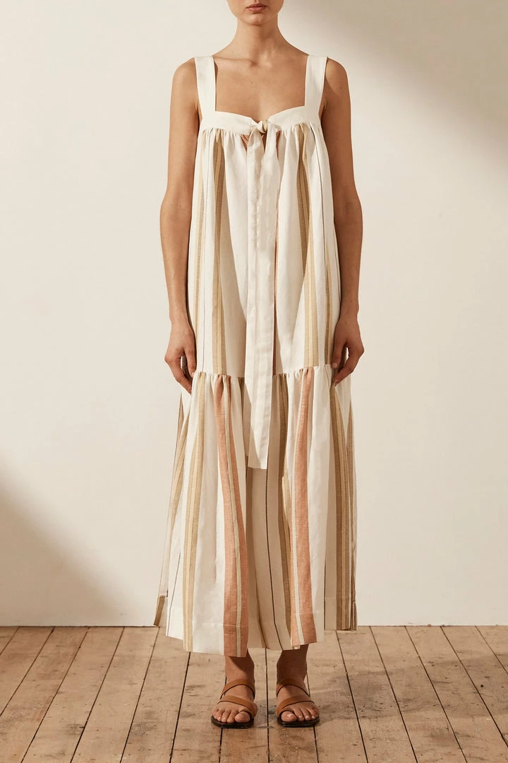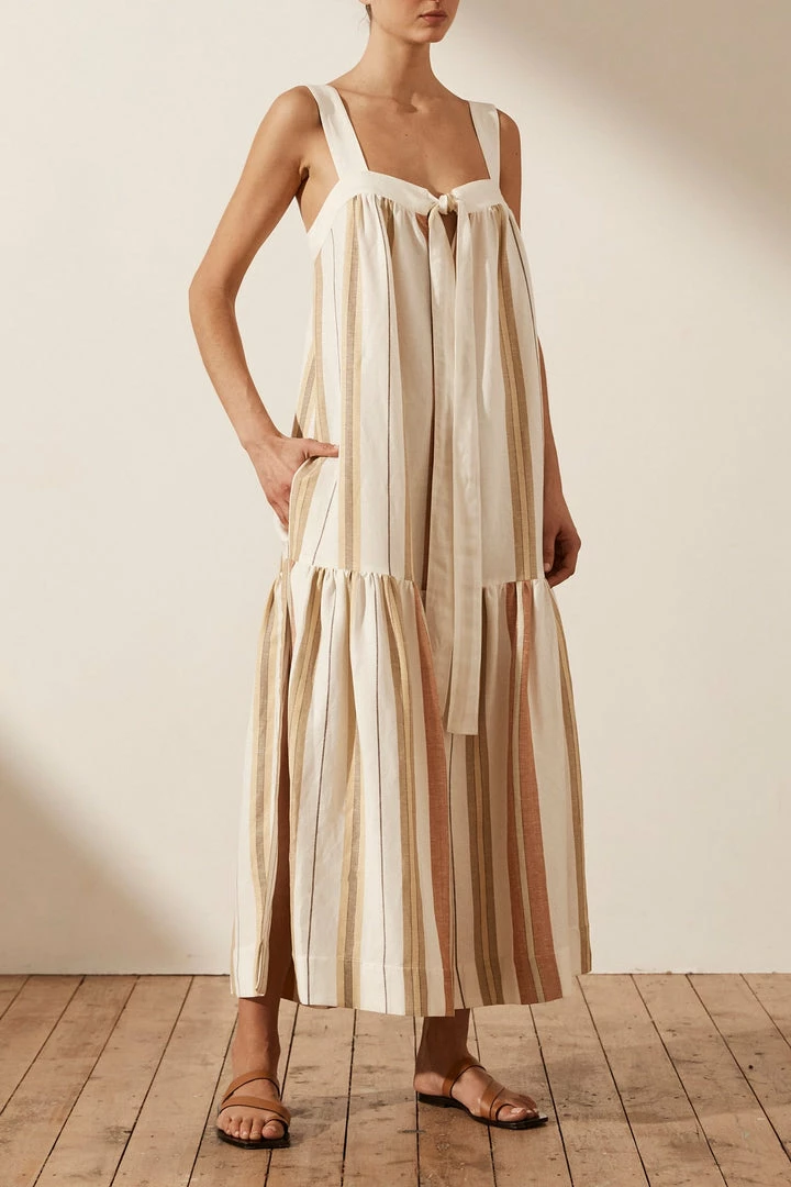Low back midi dress with front tie in the exclusive Suzana stripe.