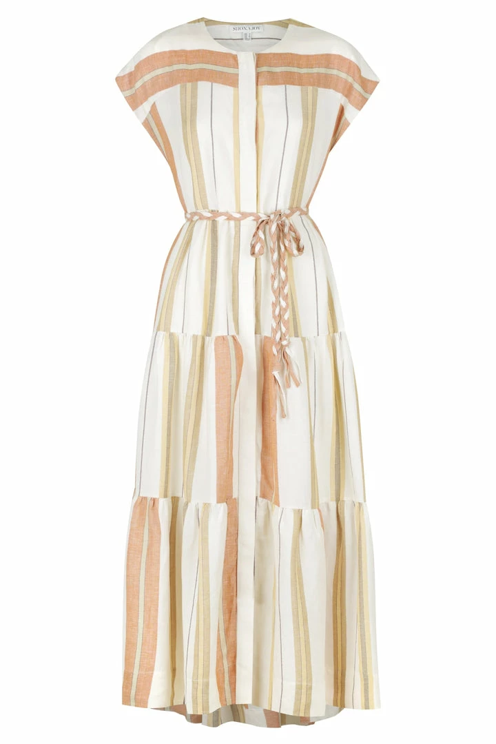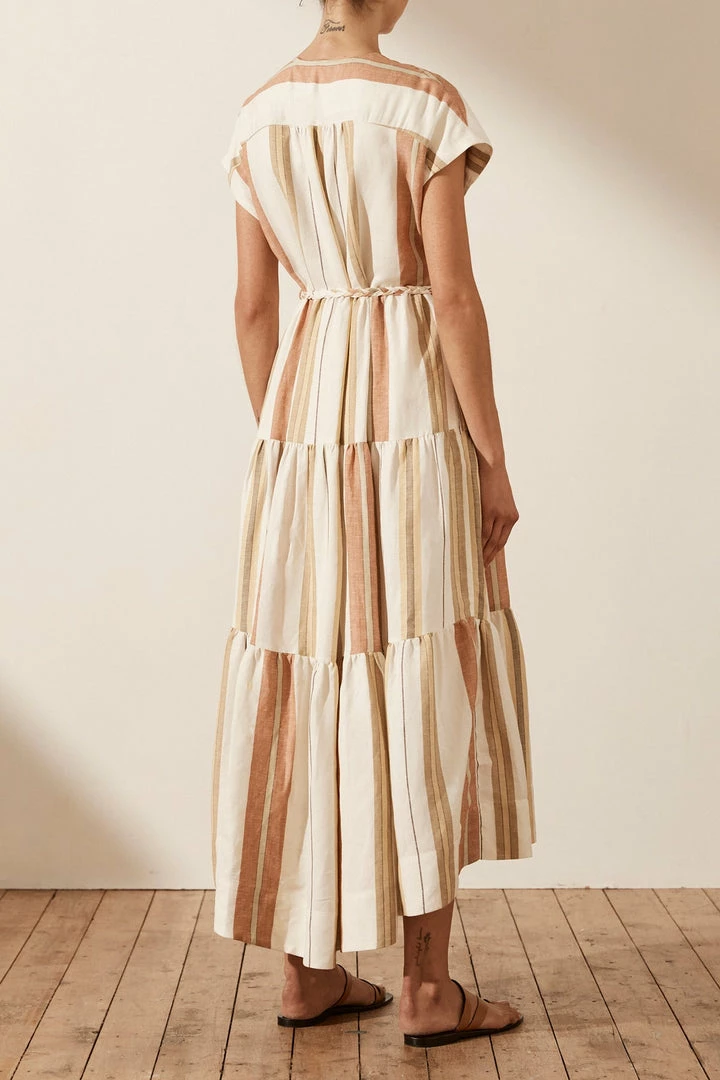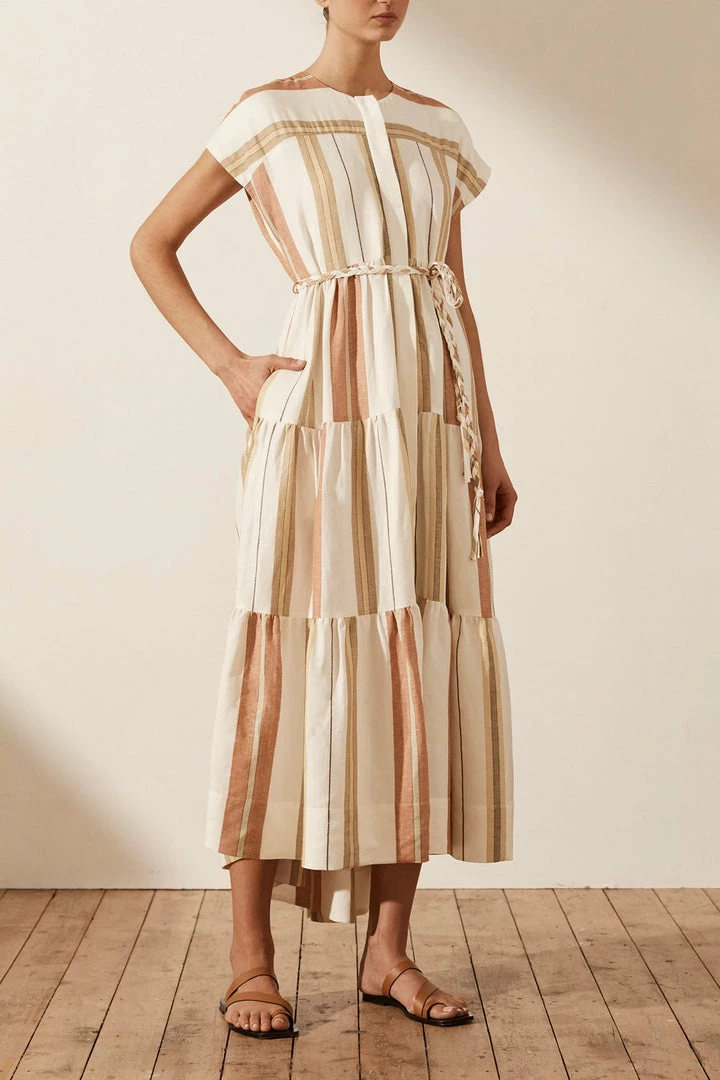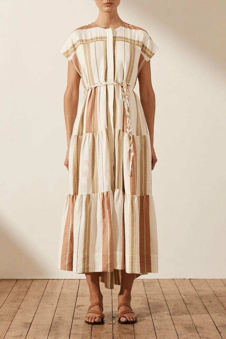Tiered midi dress with braid belt in the exclusive Suzana stripe.