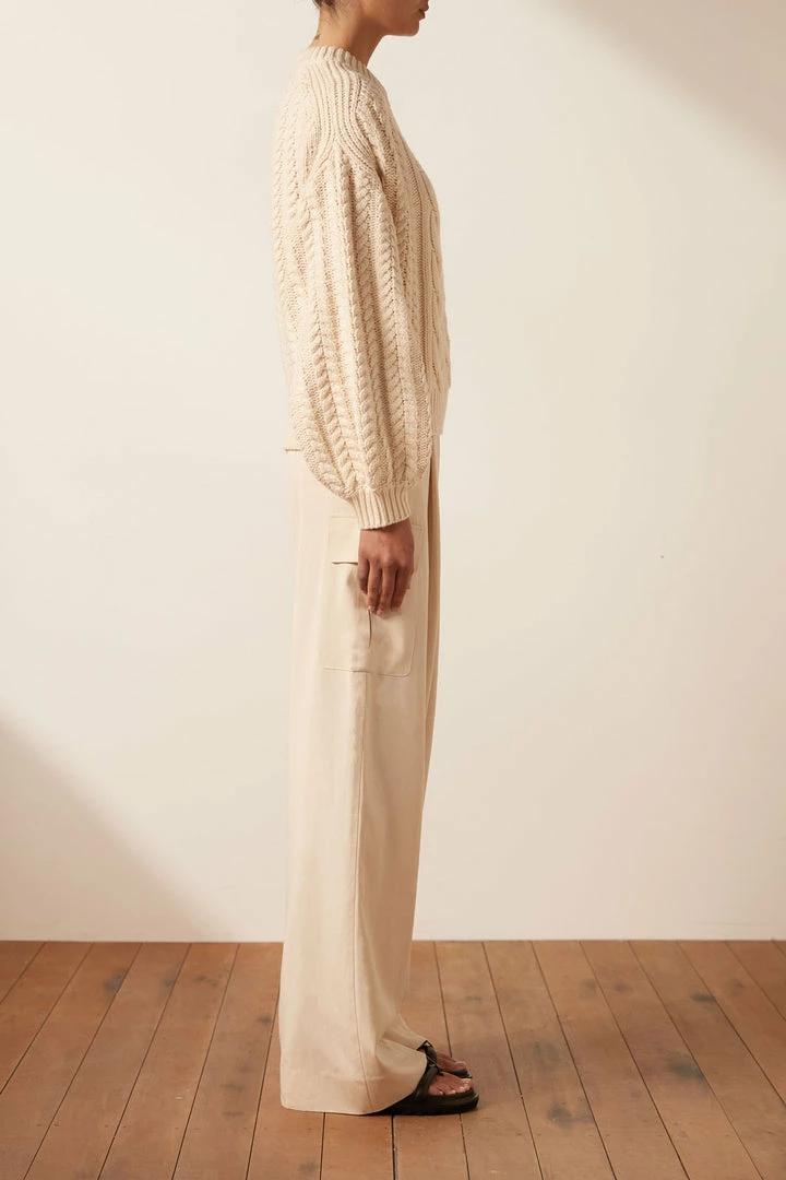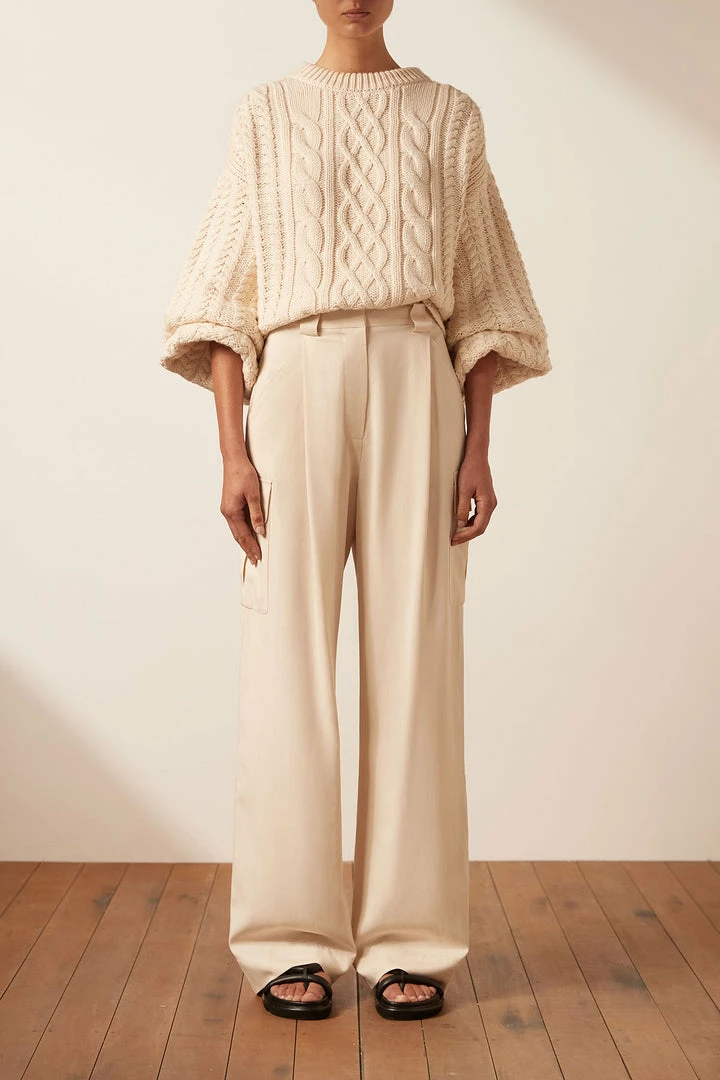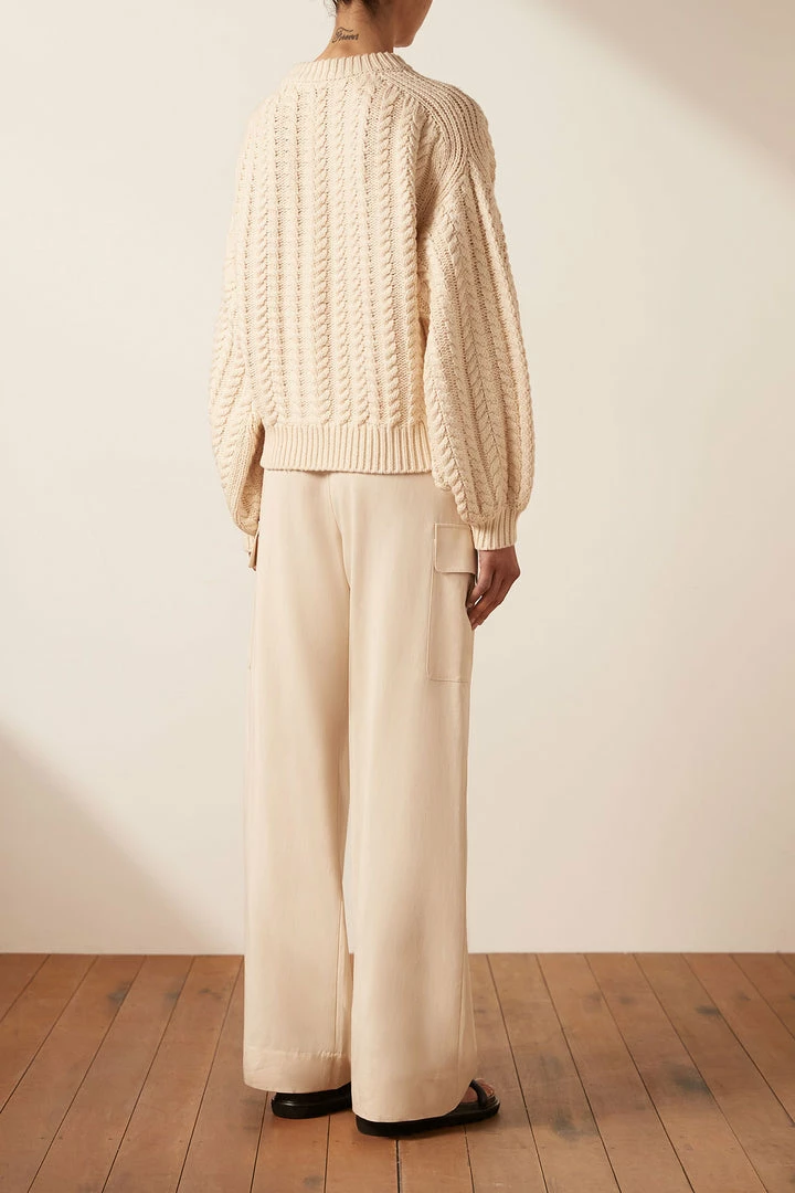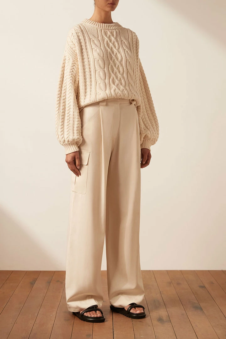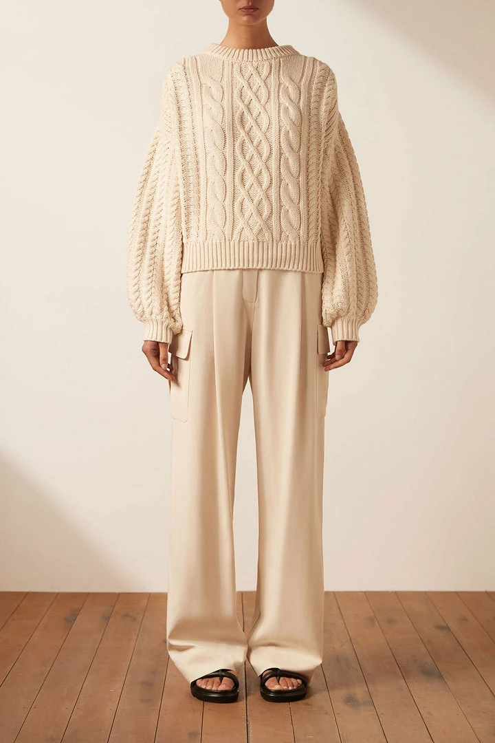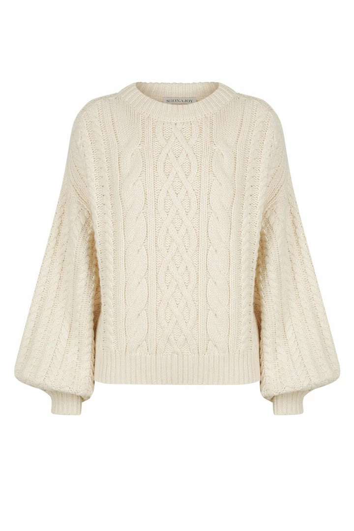Balloon sleeve cable jumper in a soft cotton blend knit.
