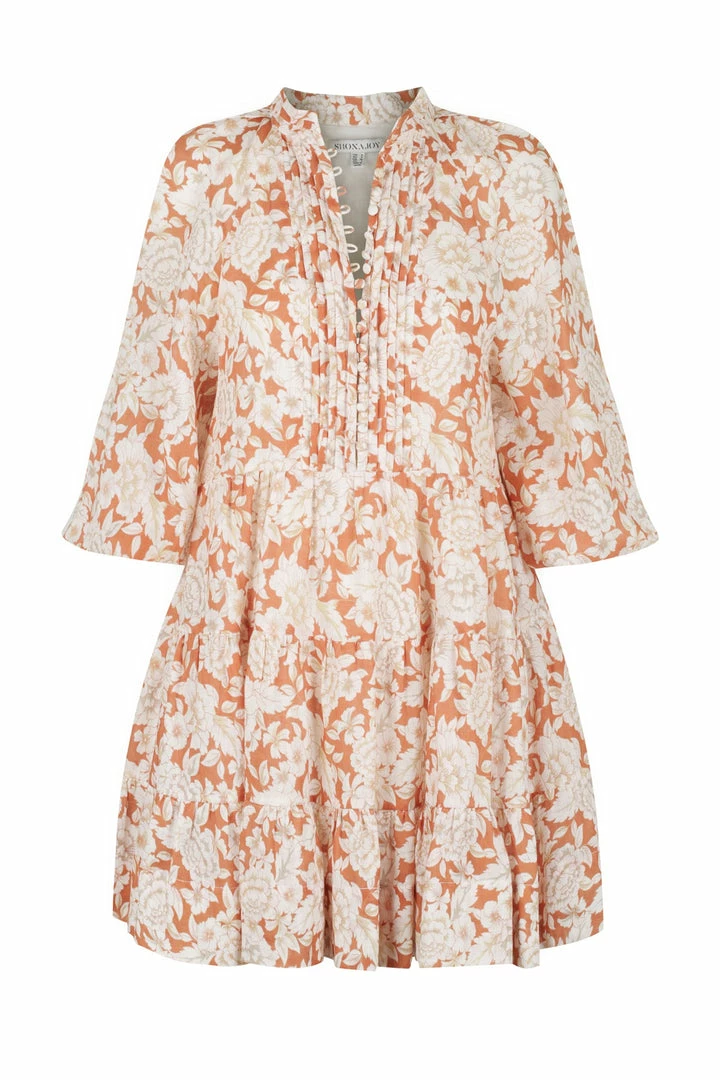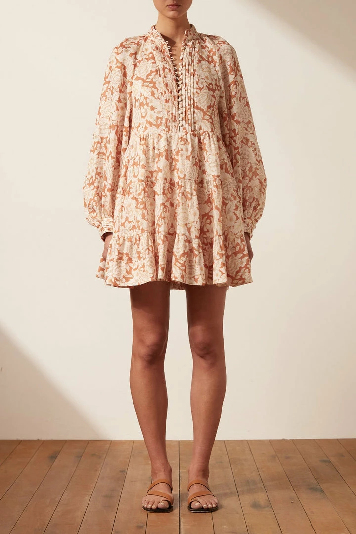 Linen balloon sleeve mini dress with pin tuck detailing in the exclusive Flor print.