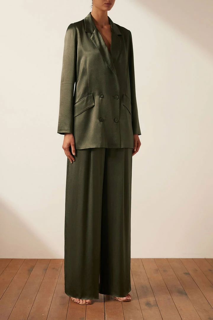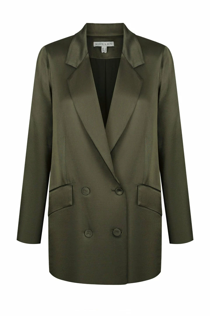 Double breasted blazer in a silk touch fabric with a luxurious sheen.