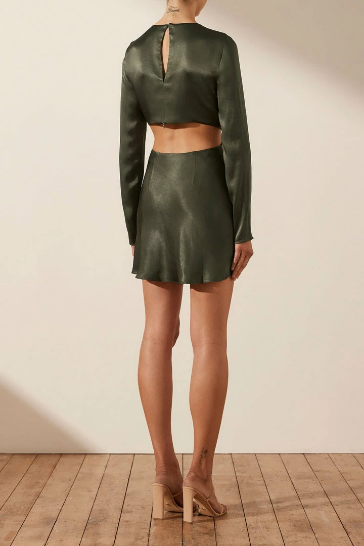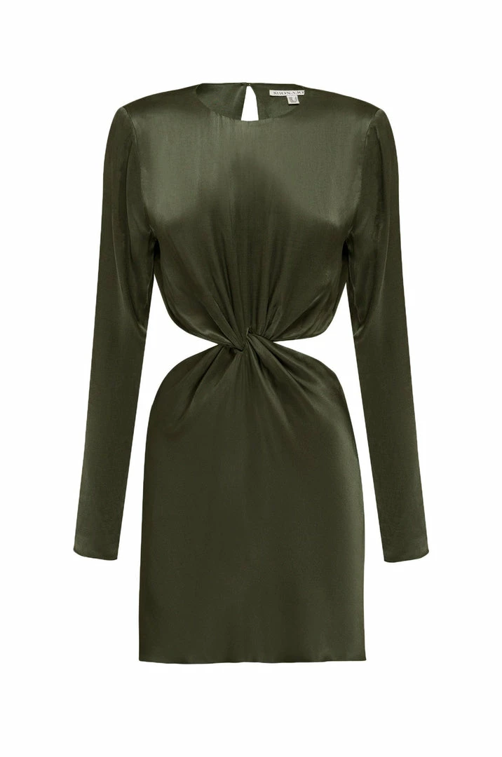 Long sleeve mini dress with twist front detail in a silk touch fabric with a luxurious sheen.