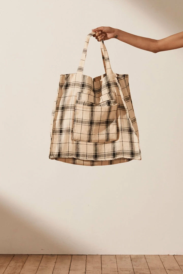 Oversized tote bag in a pure textured linen in the exclusive Indra check print.