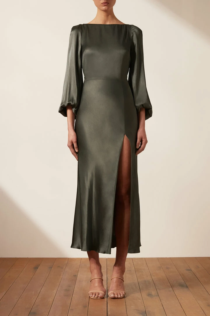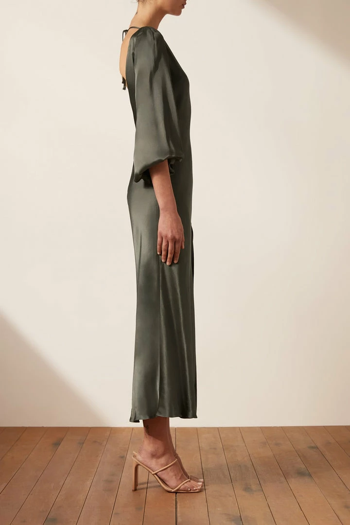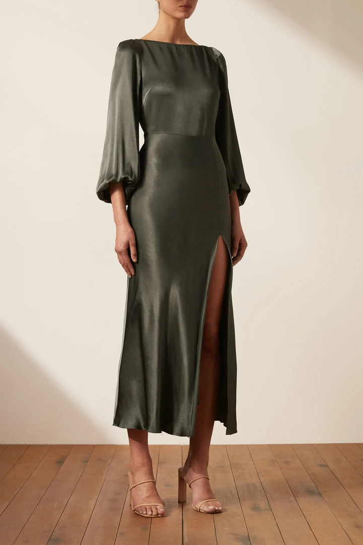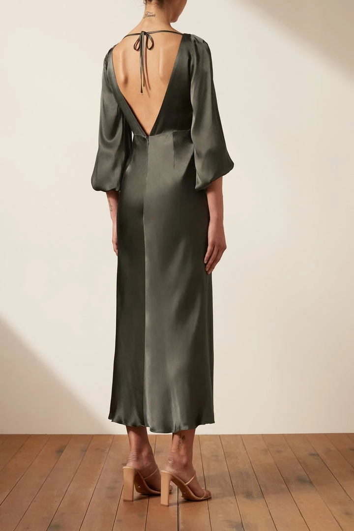 Balloon sleeve open back midi dress in a silk touch fabric with a luxurious sheen.