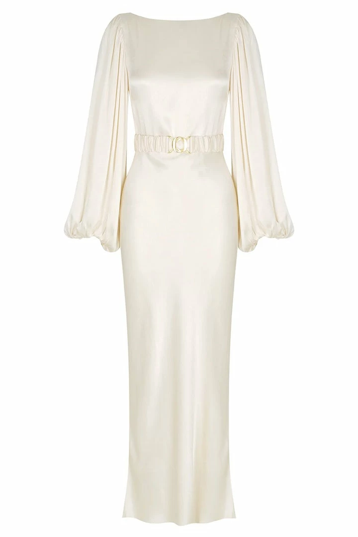 Balloon sleeve midi dress with belt in a silk touch fabric with a luxurious sheen.