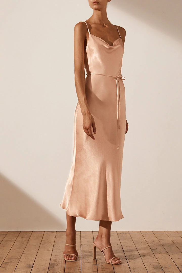 Bias cowl midi dress in a silk touch fabric with a luxurious sheen.