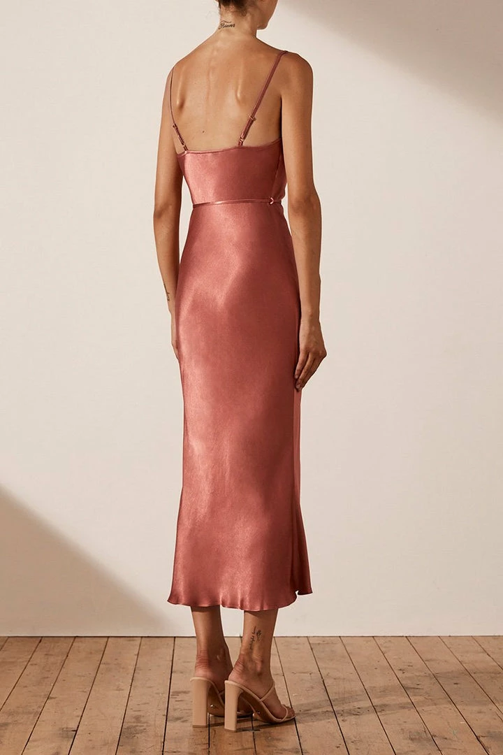 Bias cowl midi dress in a silk touch fabric with a luxurious sheen.