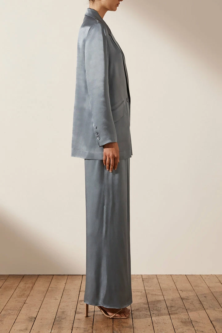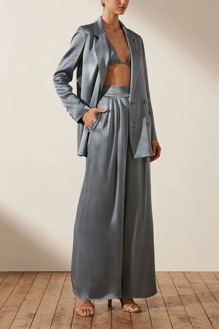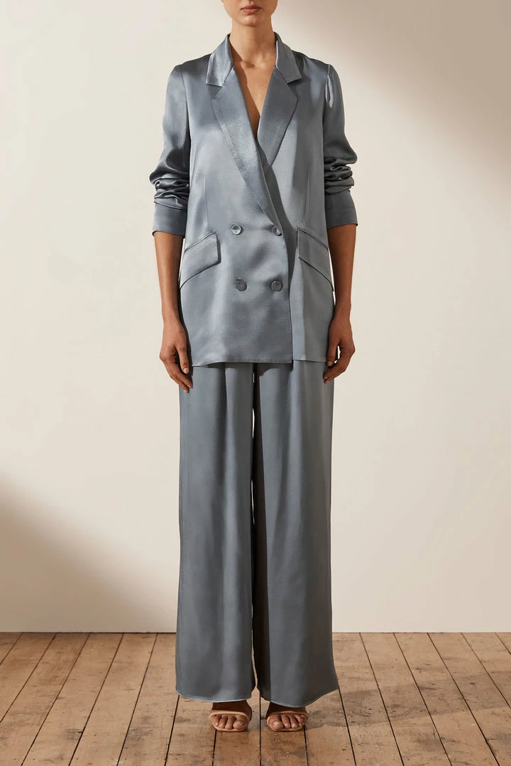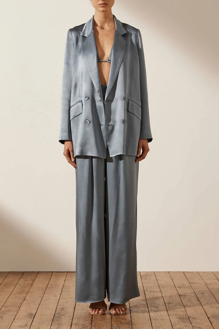 Double breasted blazer in a silk touch fabric with a luxurious sheen.