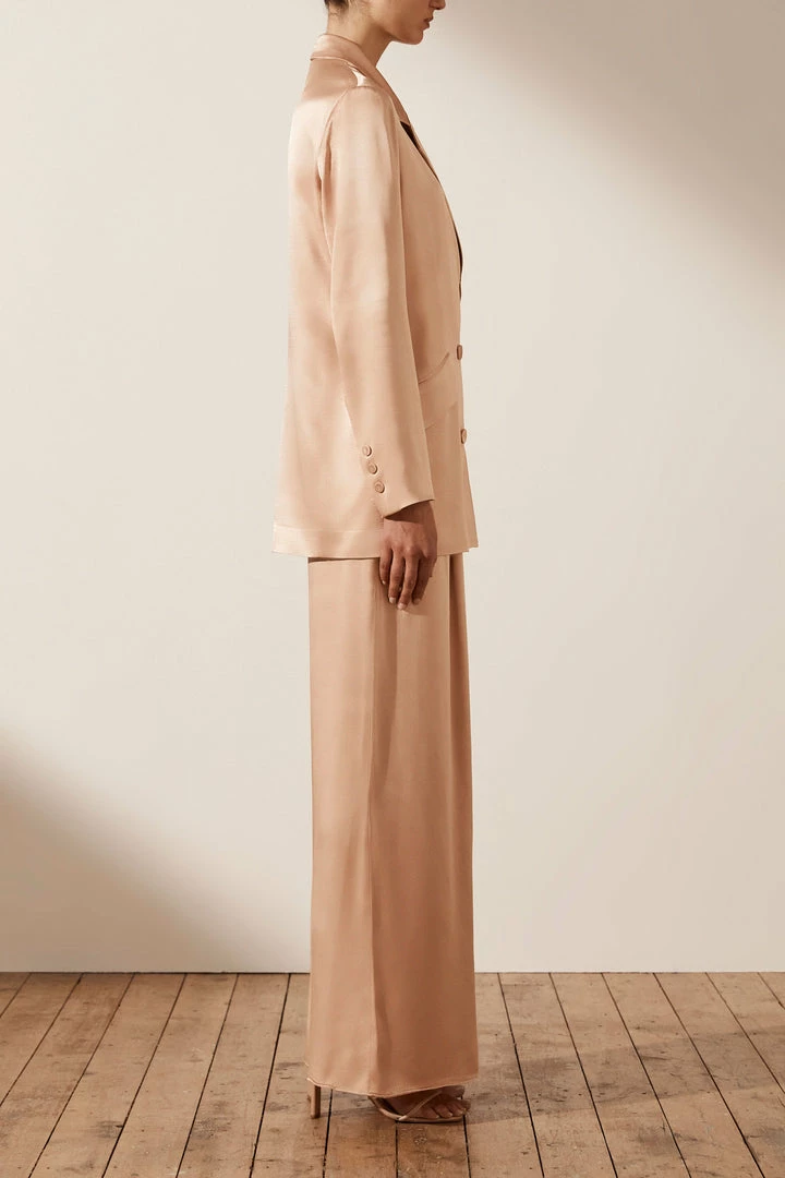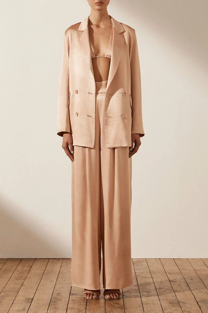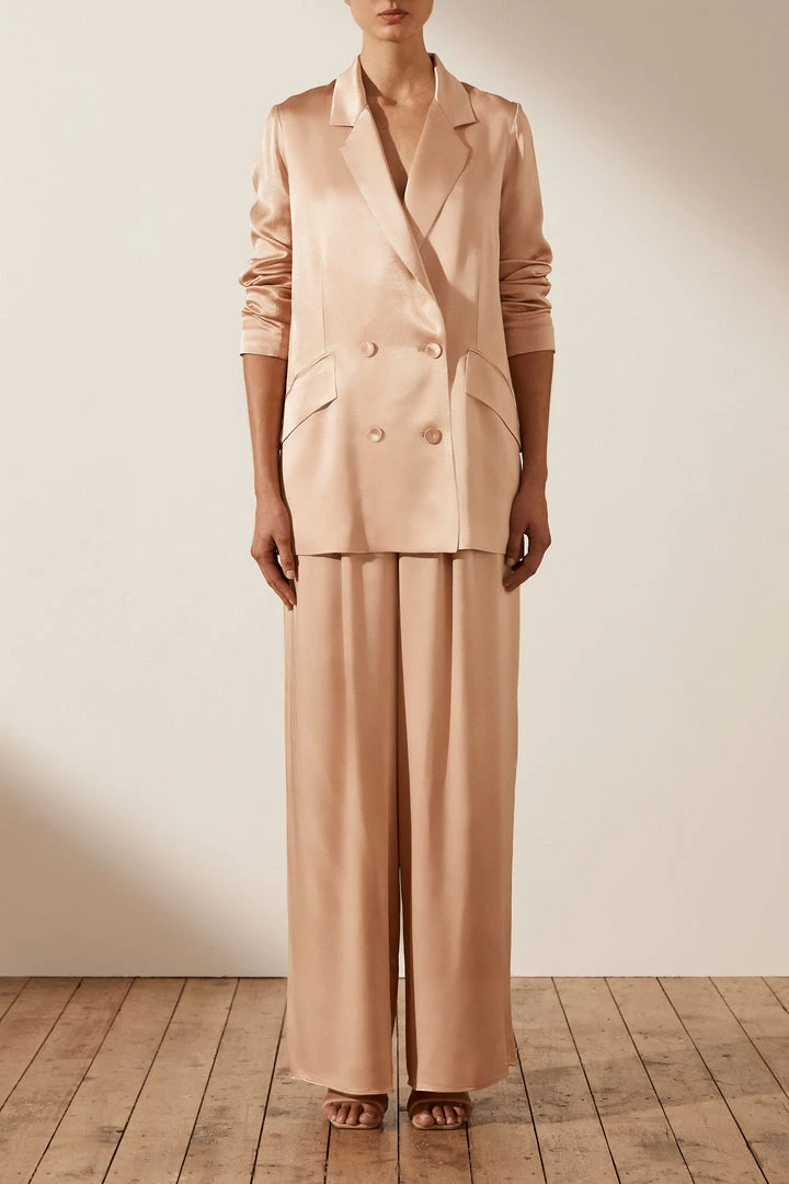 Double breasted blazer in a silk touch fabric with a luxurious sheen.
