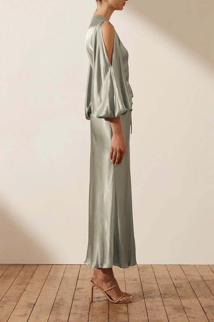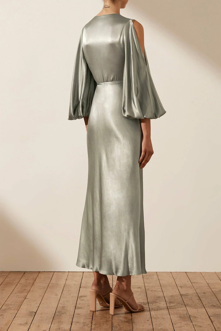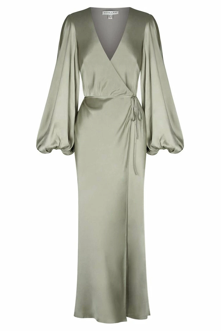 Balloon sleeve wrap midi dress in a silk touch fabric with a luxurious sheen.