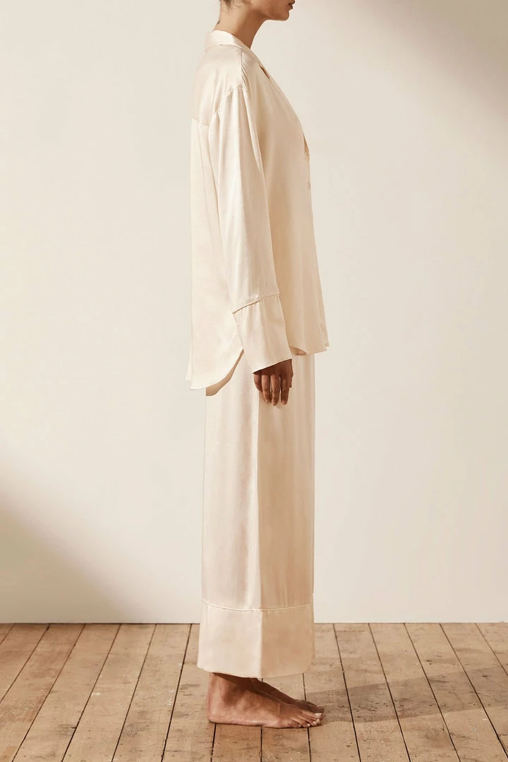 Long sleeve shirt lounge set with matching drawstring bag in a silk touch fabric with a luxurious sheen.