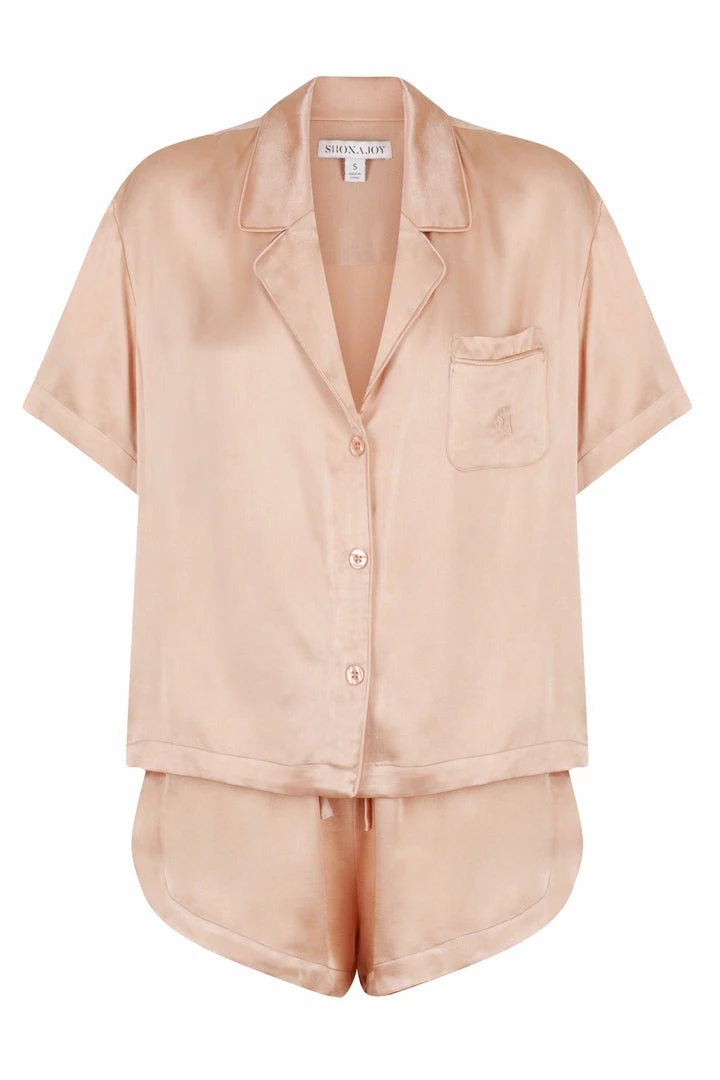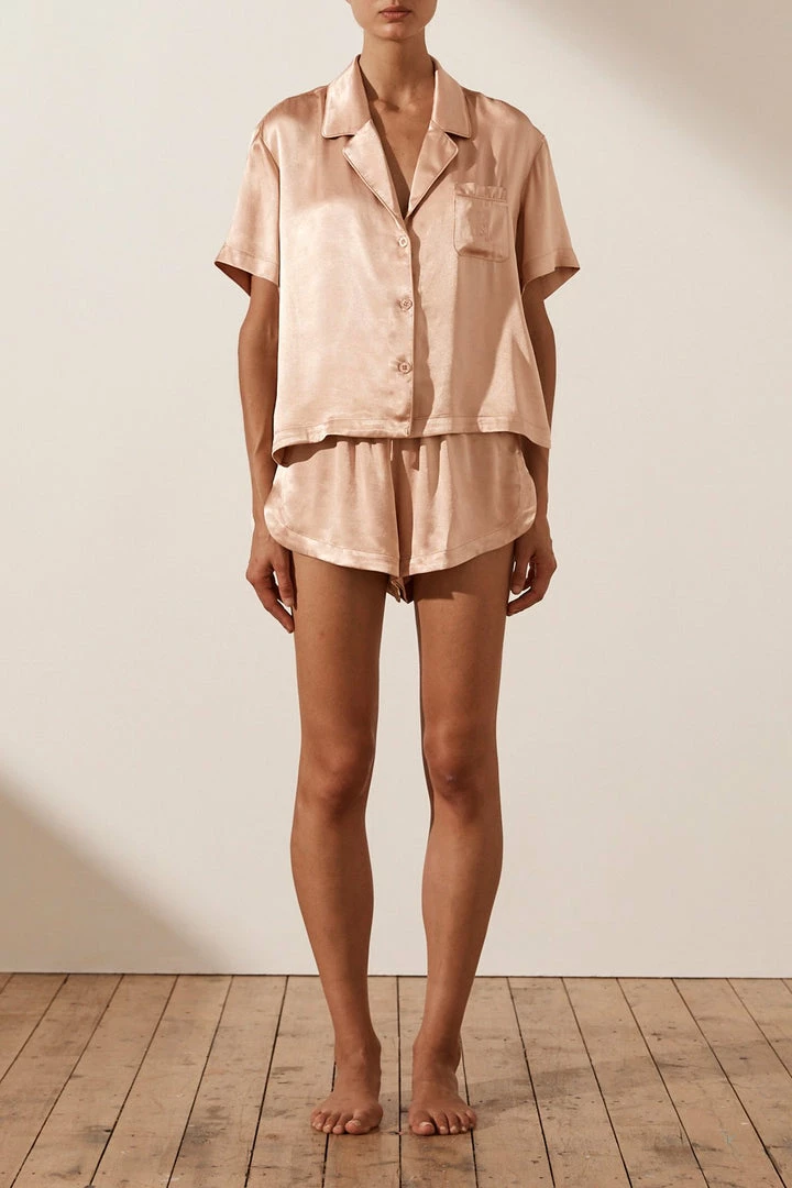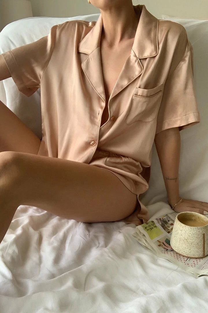 Short sleeve shirt lounge set with matching drawstring bag in a silk touch fabric with a luxurious sheen.