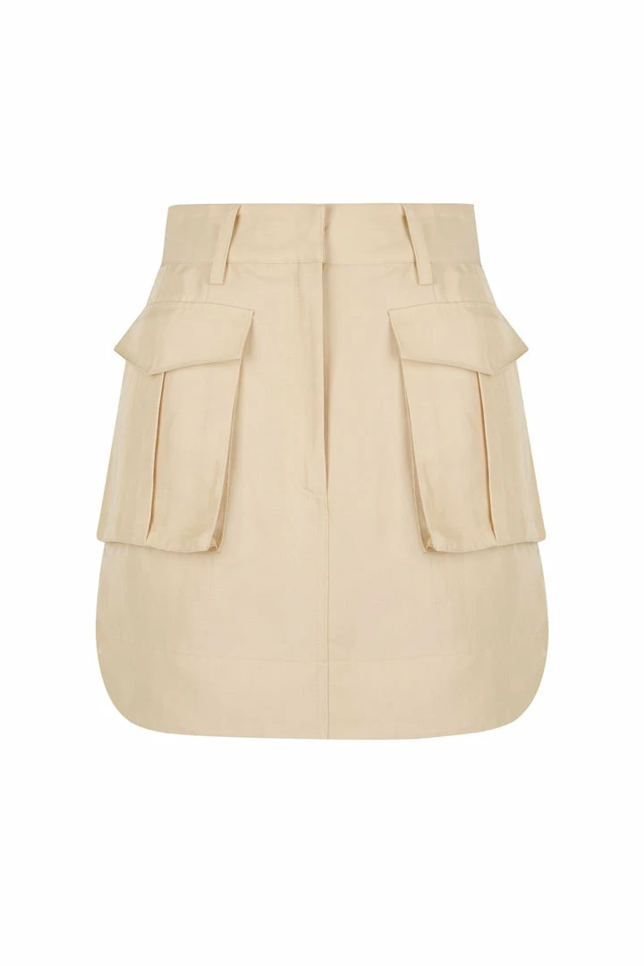 Utility mini skirt in a premium linen blend with a luxurious sheen.