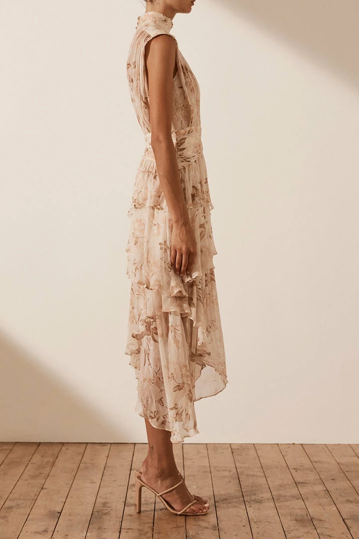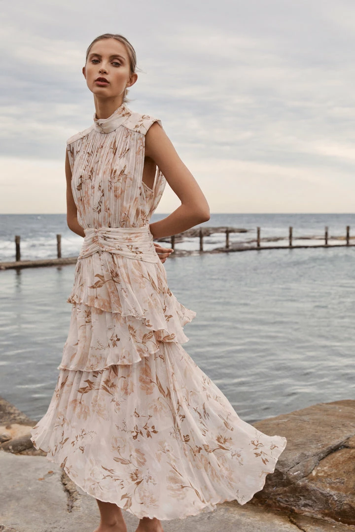 Sleeveless midi dress in a light weight semi-sheer chiffon in the exclusive Nina print.