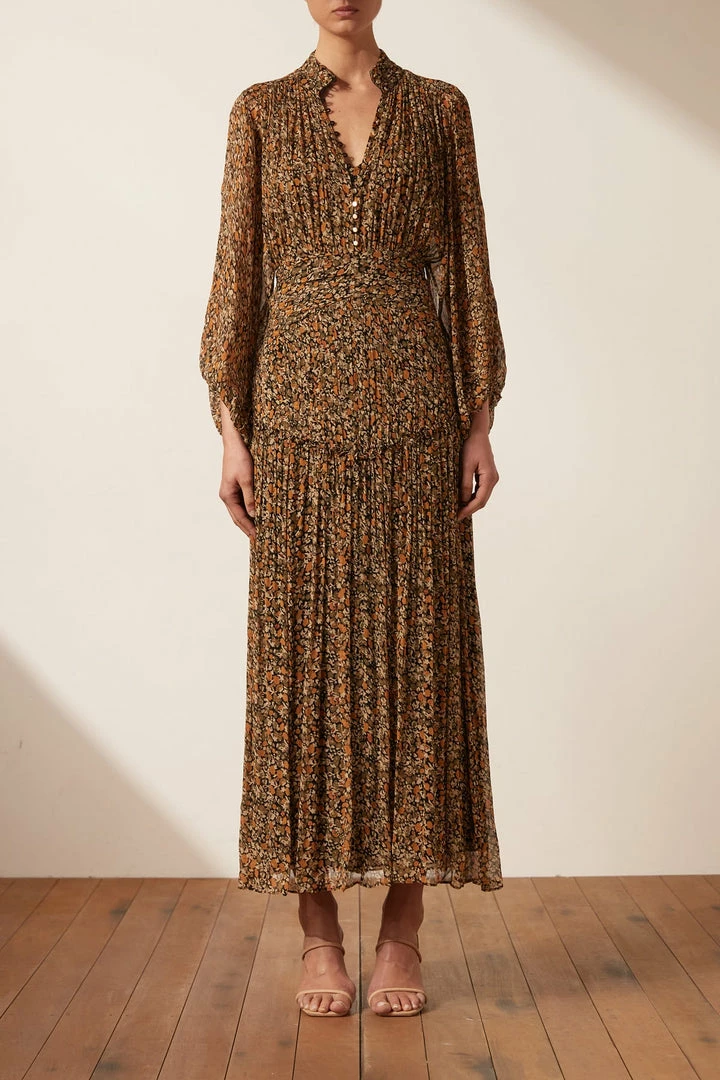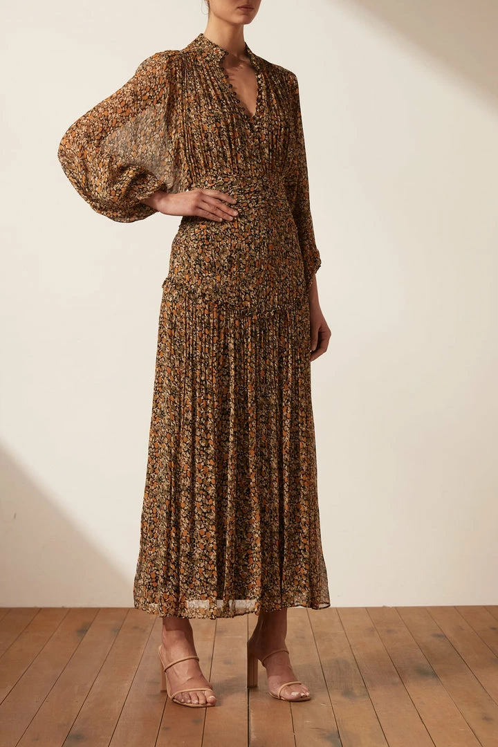 Balloon sleeve ruched midi dress in a light weight semi-sheer chiffon in the exclusive Paloma print.