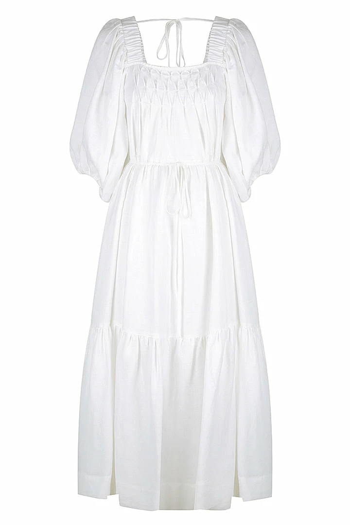 Square neck tiered midi dress in a premium linen blend.