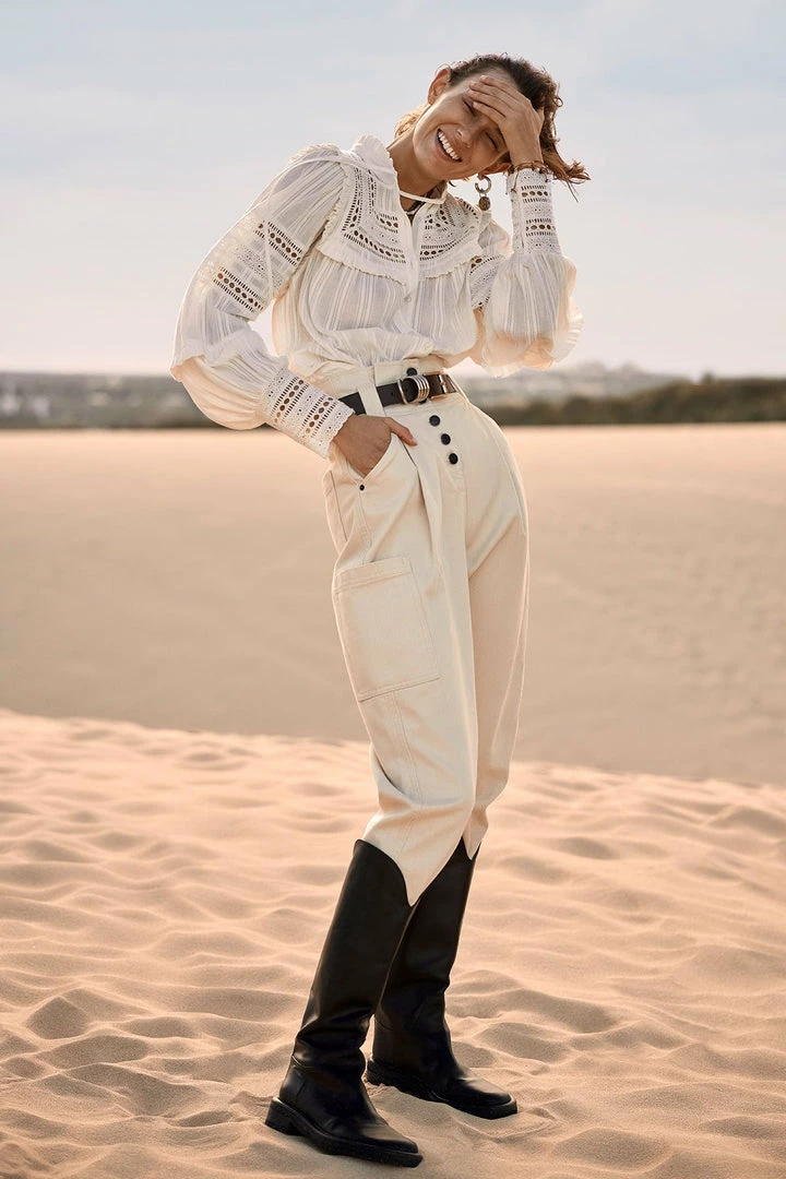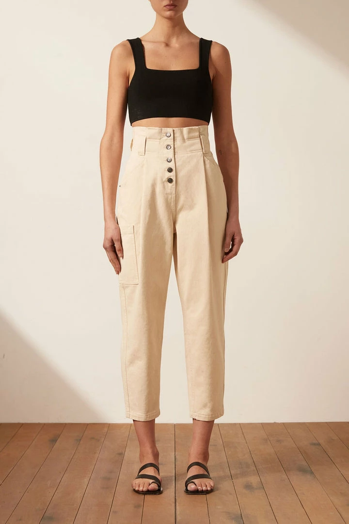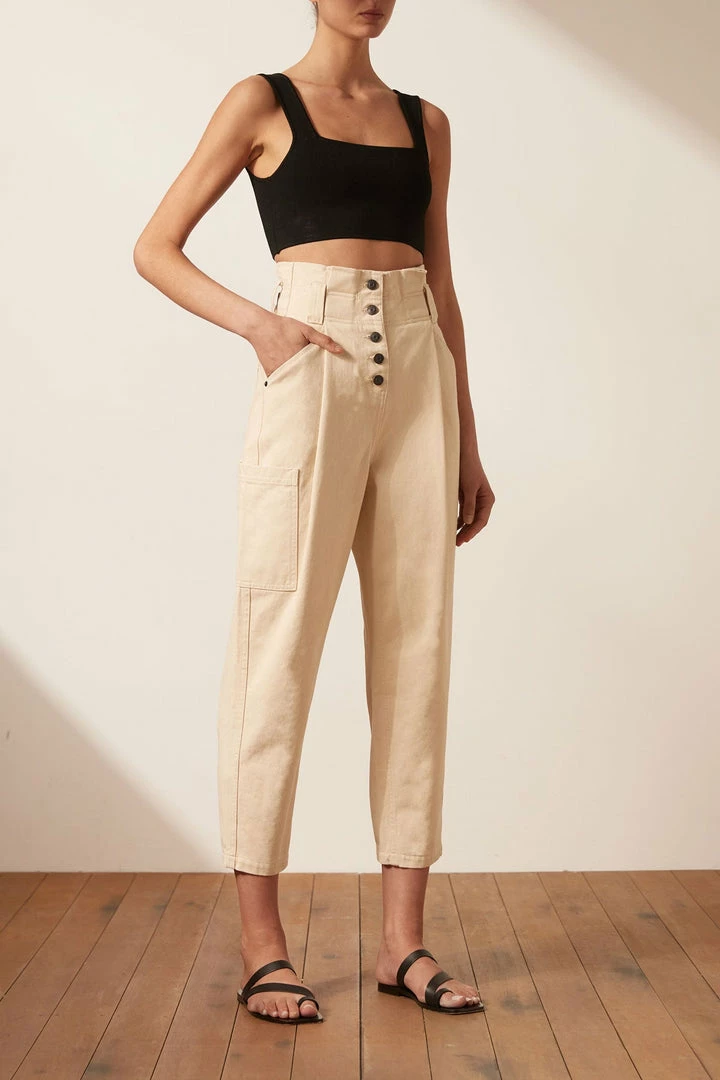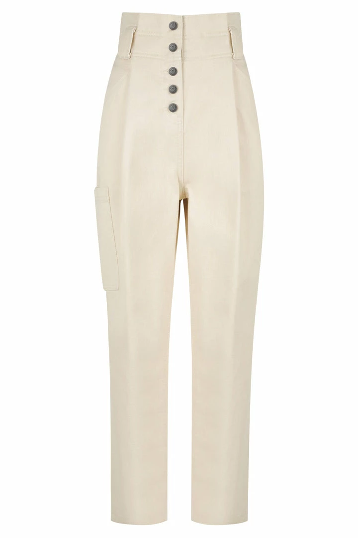 High waisted paperbag jean with side utility pocket in a cream denim.