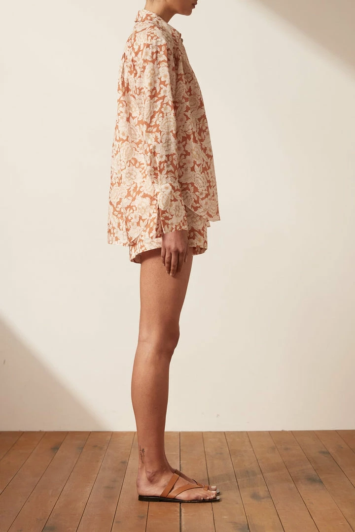 Balloon sleeve linen shirt with exaggerated cuffs in the exclusive Flor print.