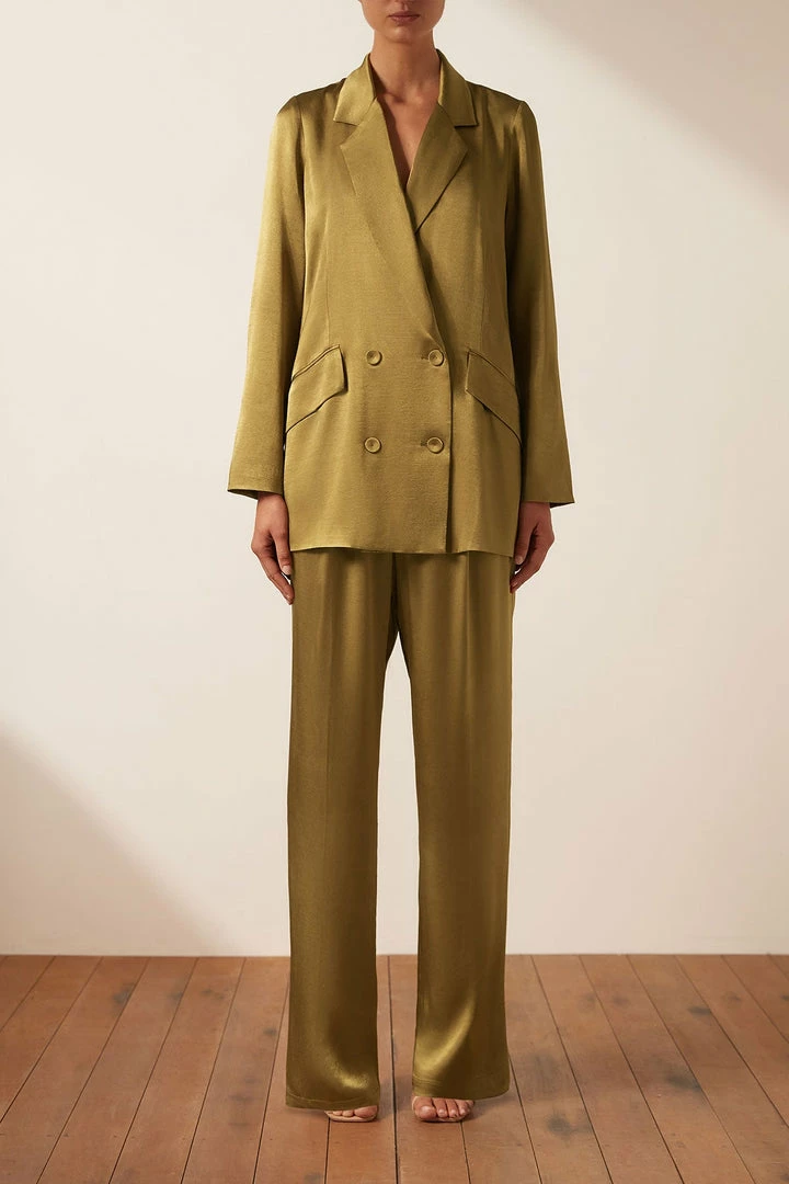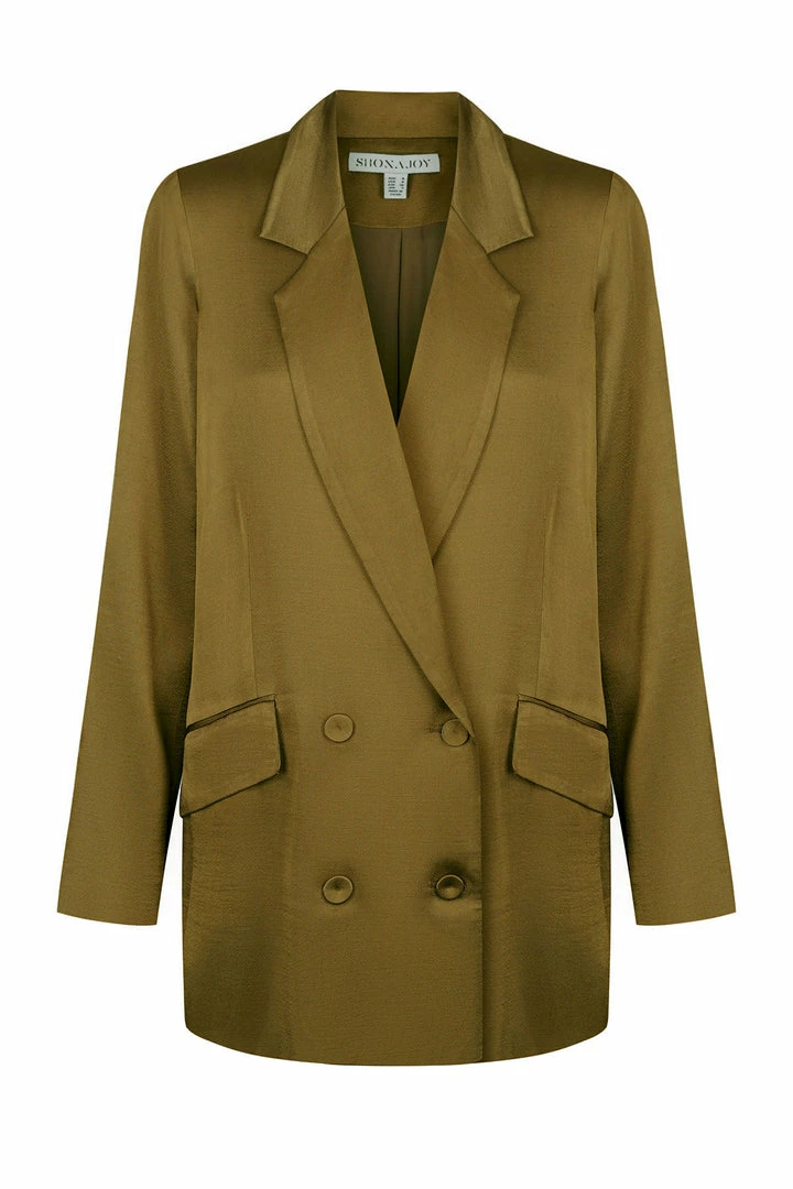 Double breasted blazer in a silk touch fabric with a luxurious sheen.