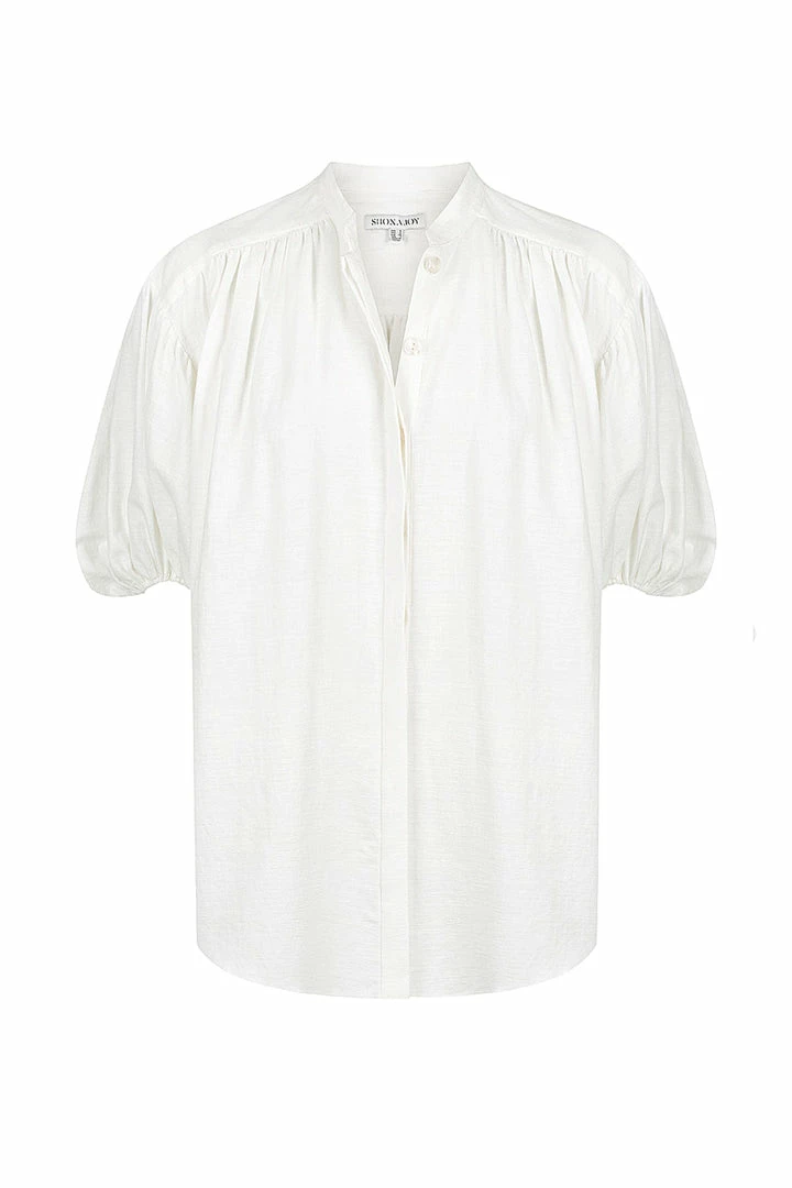 Stand collar balloon sleeve shirt in a premium cotton-linen blend.