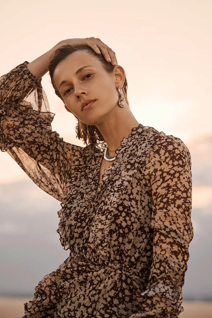 Drawstring mini dress in a light weight semi-sheer chiffon in the exclusive Valeria print.