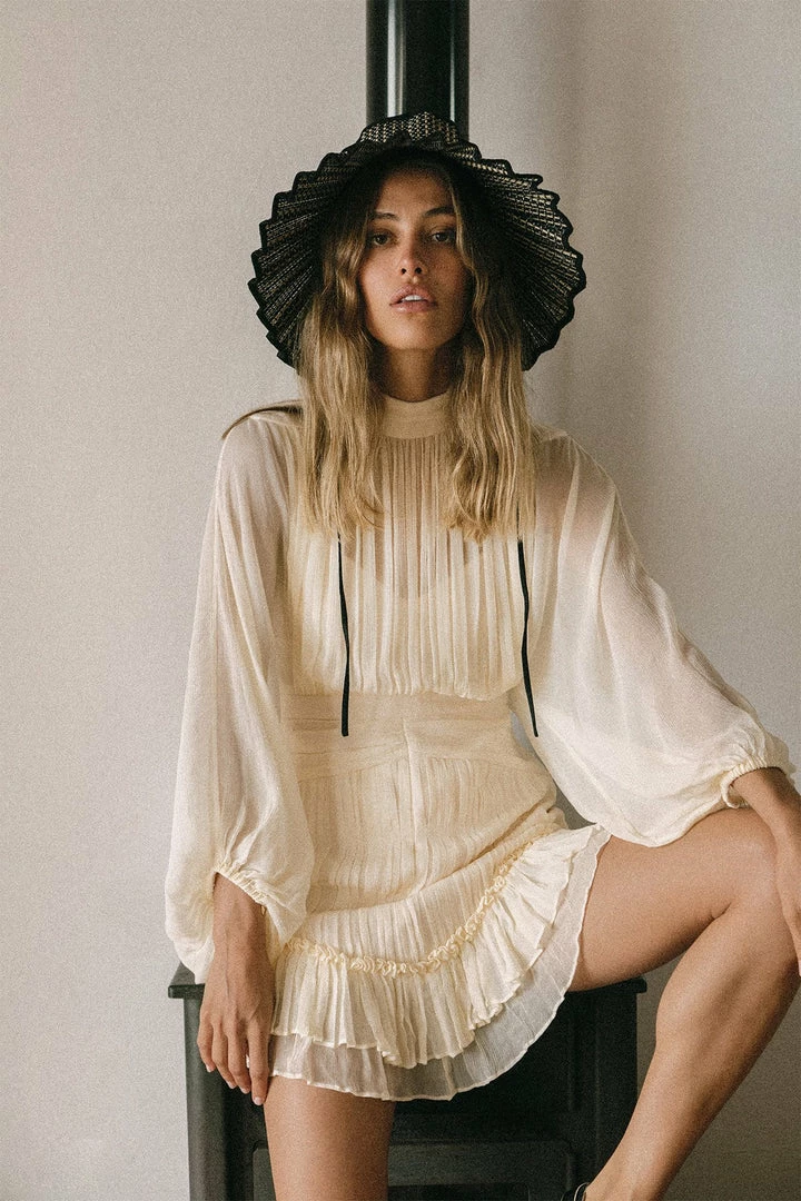 Long sleeve mini dress in a light weight semi-sheer chiffon.